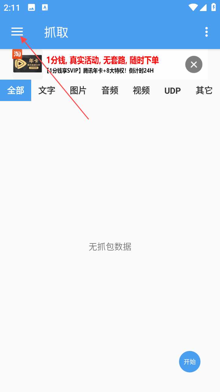 1、打開抓包精靈,進(jìn)入抓取界面,然后點(diǎn)擊左上角三條橫線的菜單圖標(biāo),即可打開側(cè)邊欄。