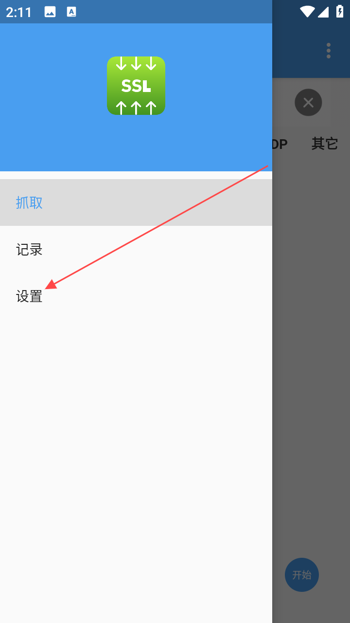 2、在左上角打開的側(cè)邊欄中點(diǎn)擊第三個(gè)選項(xiàng),選擇設(shè)置的選項(xiàng)進(jìn)入抓包精靈的設(shè)置頁(yè)面,進(jìn)行操作設(shè)置。