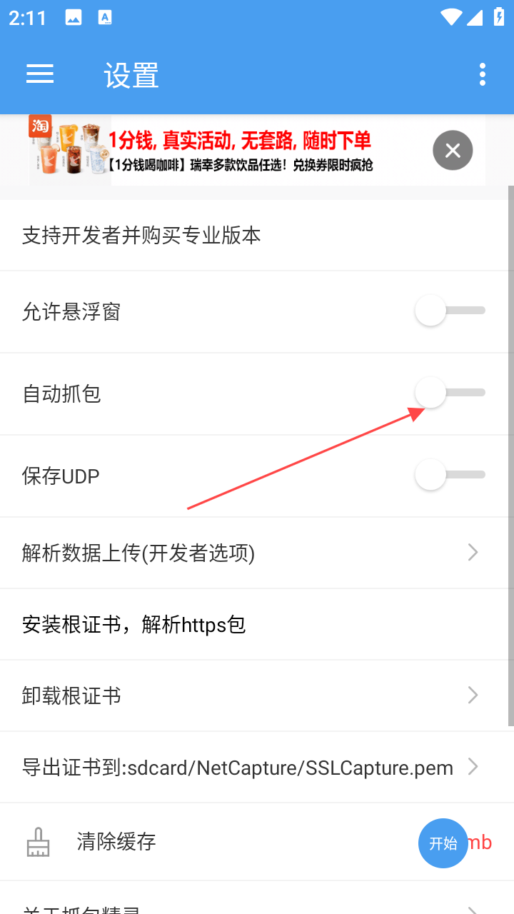 3、在設(shè)置頁(yè)面中找到自動(dòng)抓包選項(xiàng)點(diǎn)擊其右側(cè)的開關(guān)按鈕將其開啟這樣抓包精靈就能在符合條件時(shí)自動(dòng)進(jìn)行抓包操作了。