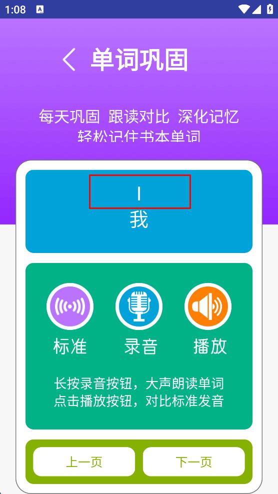 4、進(jìn)入“模塊1”的單詞鞏固界面后,可根據(jù)提示,長(zhǎng)按錄音按鈕朗讀單詞,點(diǎn)擊播放按鈕對(duì)比標(biāo)準(zhǔn)發(fā)音,進(jìn)行單詞鞏固學(xué)習(xí)。