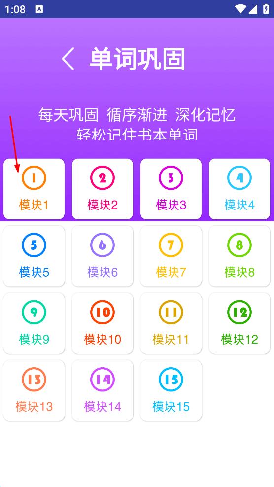 3、在單詞鞏固模塊選擇頁(yè)面,選擇要鞏固的模塊,比如“模塊1”,點(diǎn)擊該模塊。