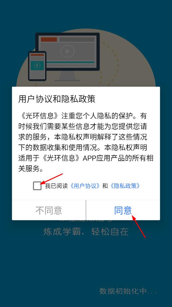 1、打開新標(biāo)準(zhǔn)英語(yǔ)三上點(diǎn)讀,在彈出的用戶協(xié)議和隱私政策提示框中,勾選我已閱讀用戶協(xié)議和隱私政策,然后點(diǎn)擊“同意”,進(jìn)入軟件主界面。