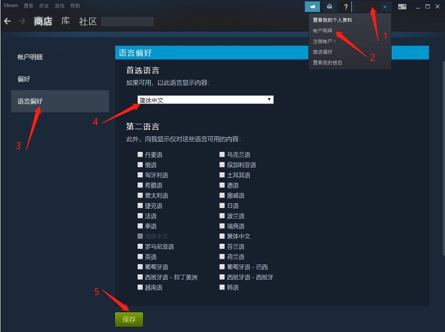 使用其他steam帳號登錄steam,然后在“帳戶明細”-“語言偏好”中將語言設置為簡體中文或英文,保存即可,參見下圖;