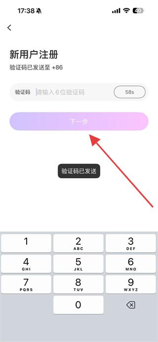 3、在新用戶注冊(cè)界面,輸入6位驗(yàn)證碼,點(diǎn)擊下一步。