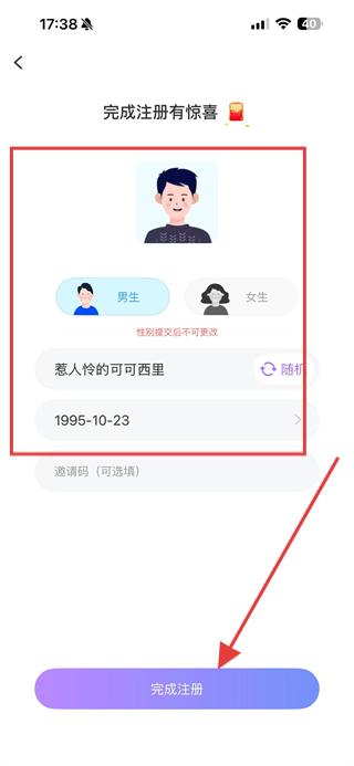 4、選擇性別,設(shè)置昵稱和生日,點(diǎn)擊完成注冊(cè)即可完成覓伊賬號(hào)注冊(cè)。