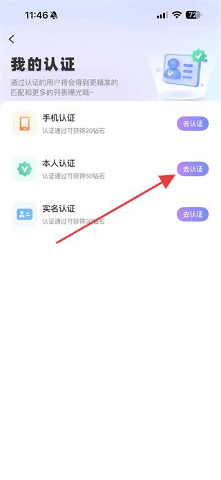 3、在我的認(rèn)證頁面,點(diǎn)擊本人認(rèn)證右側(cè)的去認(rèn)證按鈕,進(jìn)入本人認(rèn)證頁面。