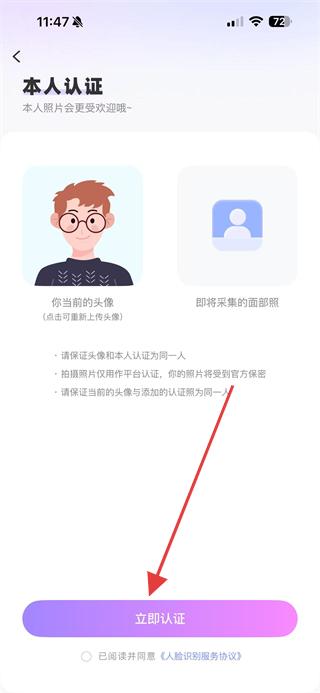4、在本人認(rèn)證頁面,點(diǎn)擊立即認(rèn)證按鈕,按照提示完成人臉識(shí)別驗(yàn)證。