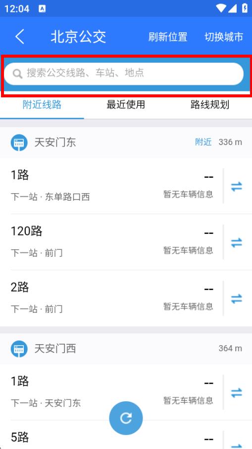 2、搜索公交線路、車站、地點的搜索欄中,輸入你想查詢的公交線路編號、公交站點名稱或地點名稱。