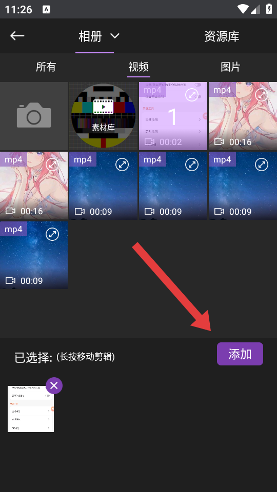 4、在頁面需要選取視頻素材點擊添加,即可進行后續(xù)的視頻編輯操作。