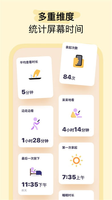 第一次拿起(手機),最長鎖屏?xí)r長(單詞不用手機的時間),睡眠時長(你放下手機的時間)等等數(shù)據(jù),而且每一項數(shù)據(jù)都可以按周、月、年進行統(tǒng)計查看。