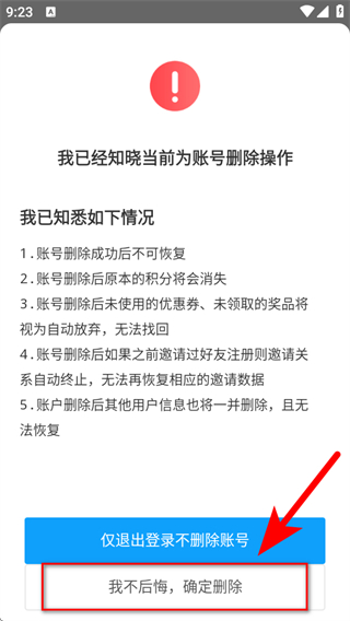 4、在注銷確認(rèn)頁面,點(diǎn)擊我不后悔,確定刪除,完成賬號注銷操作。