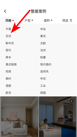 3、在彈出的風格列表里,找到并點擊日式風格選項,完成風格篩選設置。