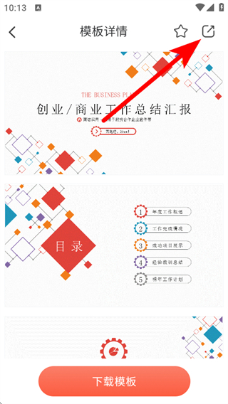 3、在模板詳情的頁(yè)面,我們需要點(diǎn)擊右上角的分享圖標(biāo)。