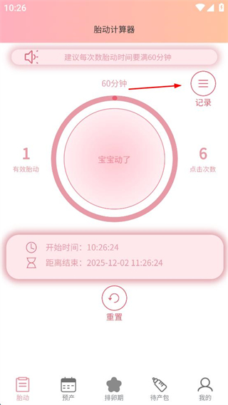 3、記錄過程中查看有效胎動和點(diǎn)擊次數(shù)的變化,再點(diǎn)擊頁面右側(cè)的記錄選項(xiàng),進(jìn)入胎動記錄界面。