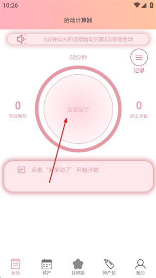 2、在胎動計(jì)算器頁面,看到中間的寶寶動了按鈕,點(diǎn)擊該按鈕開始記錄胎動的計(jì)數(shù)操作。