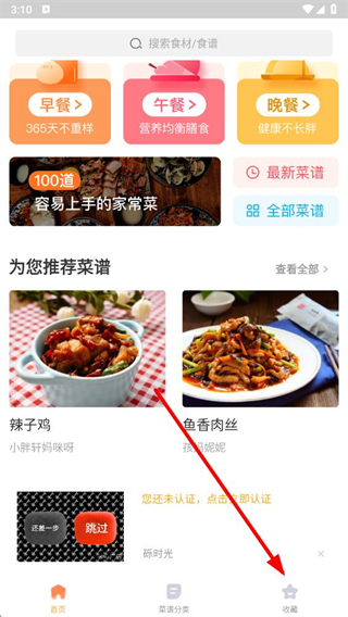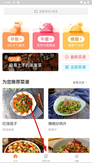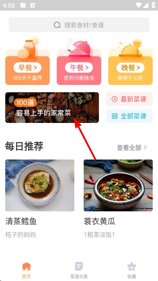 1、打開家常菜做法大全app,在首頁點擊100道容易上手的家常菜區(qū)域。