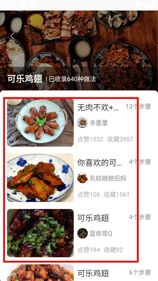 3、在菜品頁面,瀏覽眾多用戶分享的可樂雞翅做法,選擇感興趣的做法點擊進入。