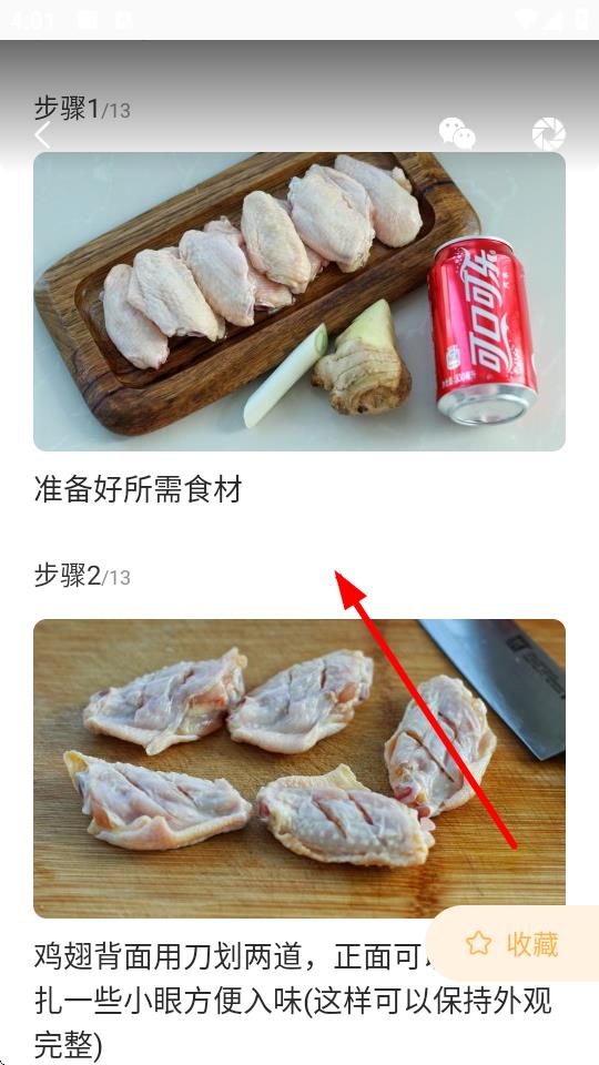 4、進入具體菜譜頁面,按步驟準備食材和烹飪,比如先準備雞翅、可樂等食材。