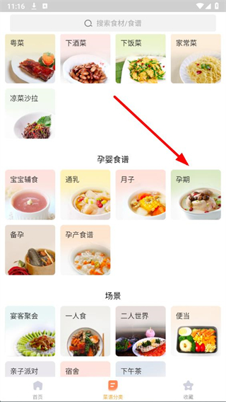 2、在菜譜分類頁面中,找到孕嬰食譜板塊,點擊孕期分類。