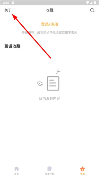 2、在收藏頁面中,找到左上角的關于選項并點擊,進入對應的關于操作界面。
