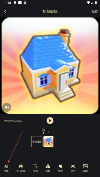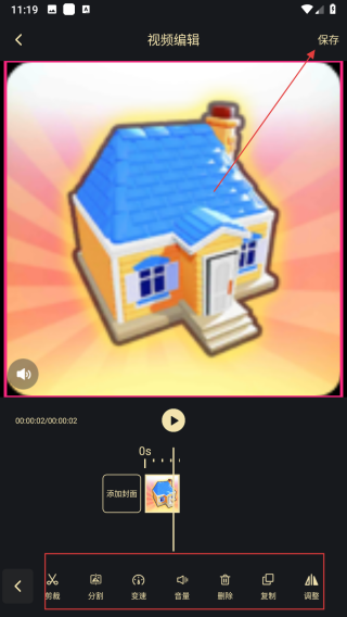 4、使用下方工具欄按照自己的需求剪輯視頻,完成視頻剪輯后,點擊右上角的保存按鈕,即可保存剪輯好的視頻。