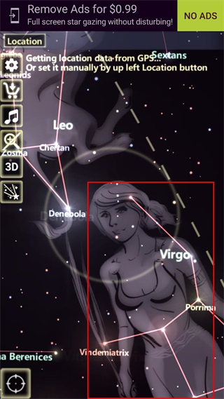 1、打開該觀星應(yīng)用,等待GPS獲取位置數(shù)據(jù),也可手動設(shè)置位置,查看當(dāng)前顯示的星座圖案。