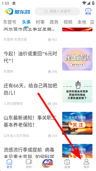 1、打開愛東營APP首頁,點(diǎn)擊底部我的按鈕,進(jìn)入個(gè)人的頁面。