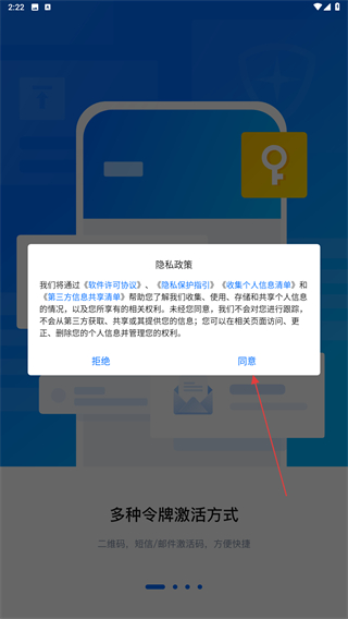 1、打開騰訊身份驗證器APP,進入時會彈出隱私政策,點擊同意的按鈕。
