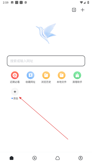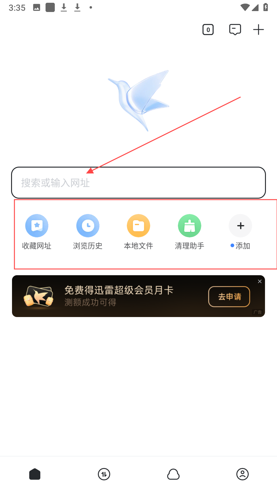 1、打開(kāi)迅雷網(wǎng)盤進(jìn)入主界面,點(diǎn)擊搜索或輸入網(wǎng)址欄可進(jìn)行資源搜索,下方收藏網(wǎng)址,瀏覽歷史等功能可快速訪問(wèn)常用或歷史瀏覽內(nèi)容,本地文件能查看本地存儲(chǔ)。