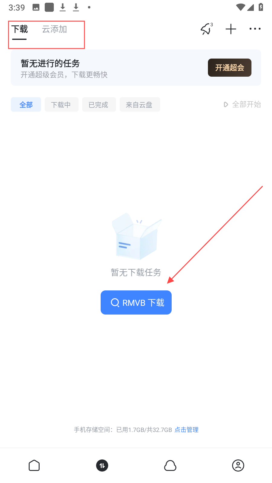 2、點(diǎn)擊底部導(dǎo)航欄第二個(gè)圖標(biāo)進(jìn)入下載界面,在這里能看到下載和云添加選項(xiàng),點(diǎn)擊RMVB下載等按鈕可添加下載任務(wù),還能切換查看下載中、已完成等不同狀態(tài)的任務(wù)。