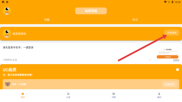1、在主頁界面中點(diǎn)擊請(qǐng)選擇游戲右側(cè)的點(diǎn)擊選擇按鈕,進(jìn)入游戲選擇界面,開啟游戲篩選流程。