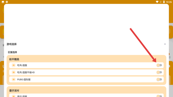 2、進(jìn)入游戲選擇界面后,在區(qū)服選擇中找到目標(biāo)游戲如和平精英,開啟對(duì)應(yīng)區(qū)服如吃雞-國服的選擇開關(guān)。