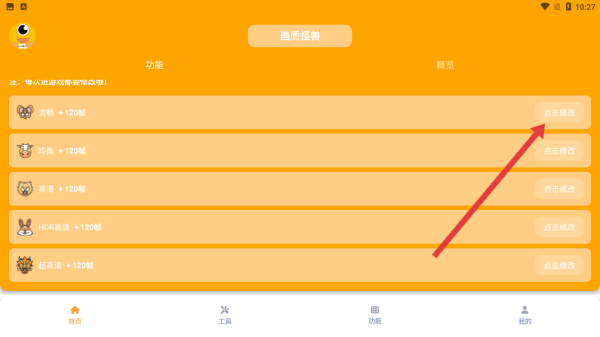 3、回到主界面的畫質(zhì)修改列表,找到目標(biāo)游戲,通過點(diǎn)擊其右側(cè)的點(diǎn)擊修改按鈕,進(jìn)行畫質(zhì)調(diào)整。