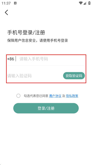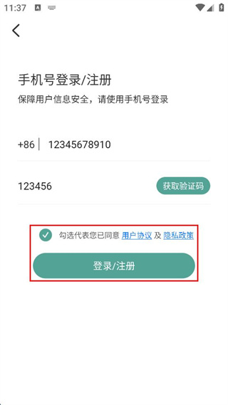3、輸入收到的驗(yàn)證碼,勾選同意用戶協(xié)議及隱私政策。