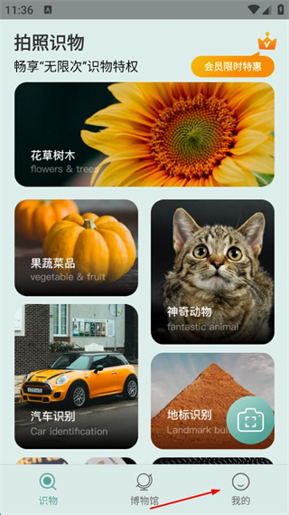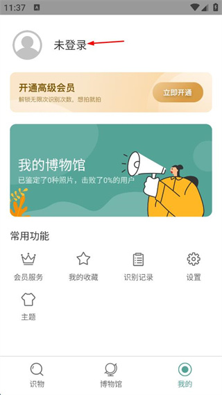 1、打開(kāi)拍照識(shí)物類軟件,點(diǎn)擊“我的”,進(jìn)入個(gè)人頁(yè)面,點(diǎn)擊未登錄。
