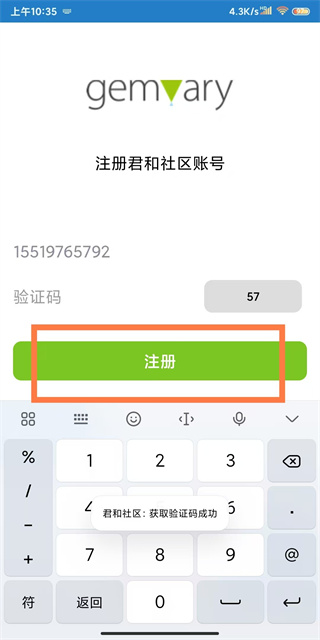 3、輸入獲取的驗(yàn)證碼后,點(diǎn)擊注冊(cè)按鈕。