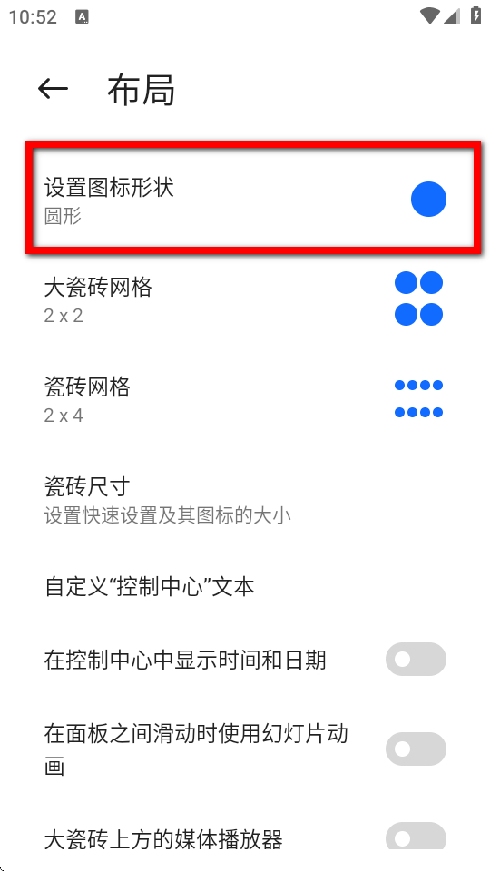2、在布局設(shè)置界面,點(diǎn)擊設(shè)置圖標(biāo)形狀選項(xiàng),彈出形狀選擇菜單。