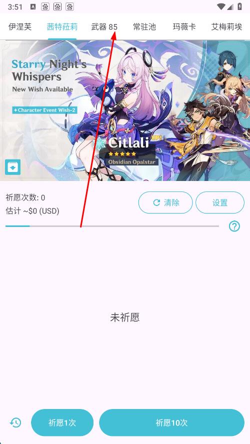 1、打開原神抽卡模擬器,在界面上方找到武器85選項卡并點擊,進入武器祈愿卡池界面。