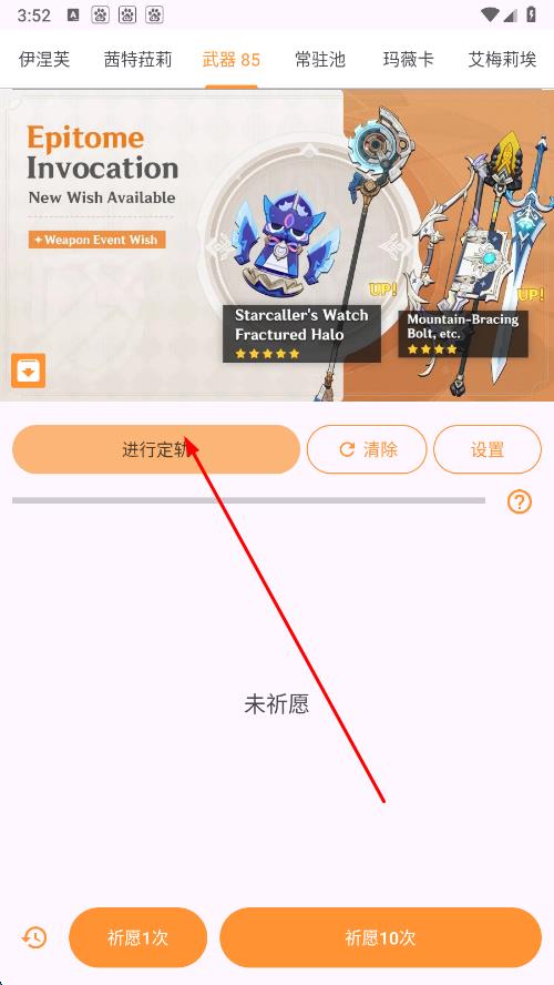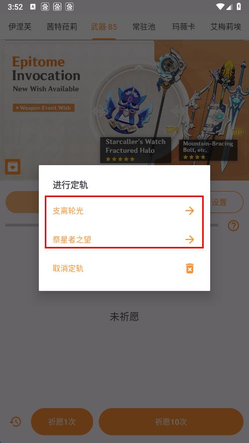 2、在武器祈愿卡池界面中,點擊進行定軌按鈕,彈出定軌選項。