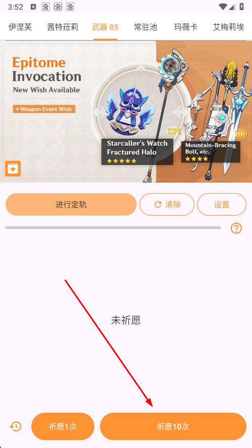 4、完成定軌選擇后,點擊界面下方的祈愿10次按鈕,進行武器抽卡模擬并查看結果。