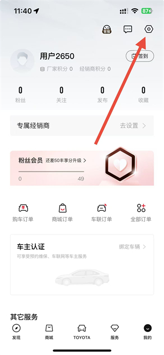 2、在我的頁面右上角,找到設(shè)置圖標(biāo)并點(diǎn)擊,進(jìn)入設(shè)置功能操作界面。
