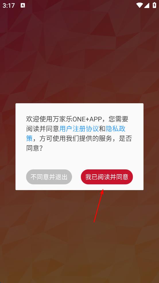 1、打開萬家樂ONE+APP,在彈出的用戶注冊協(xié)議和隱私政策提示框中,點擊我已閱讀并同意。