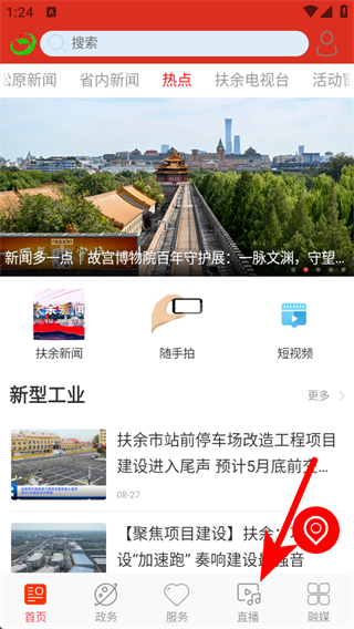 1、打開大美扶余首頁,點(diǎn)擊底部直播,進(jìn)入直播功能板塊頁面。