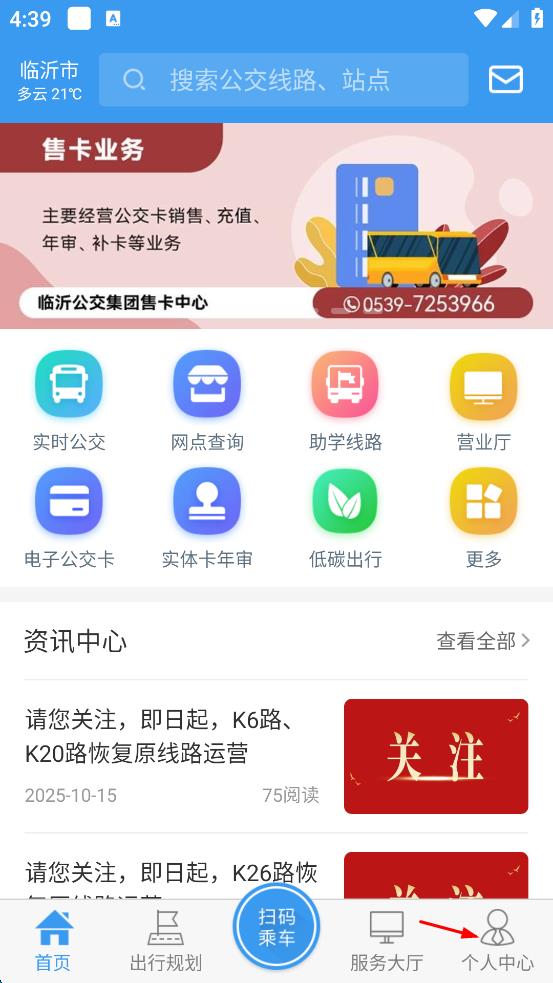 1、打開臨沂公交APP,進入首頁后,點擊頁面右下角“個人中心”選項。