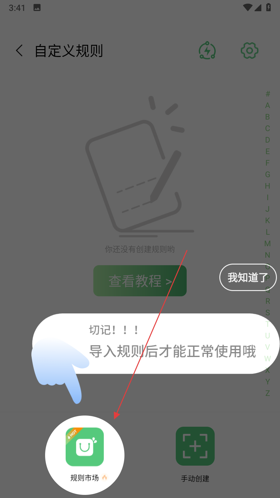 1、打開綠去廣告App進入自定義規(guī)則界面,若沒有創(chuàng)建過規(guī)則,點擊規(guī)則市場圖標,進入規(guī)則獲取頁面。