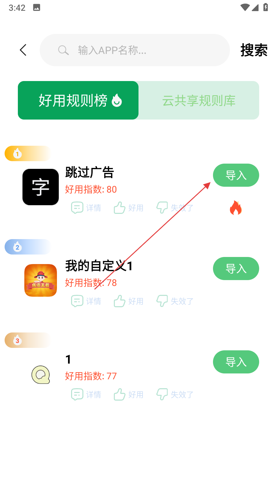 2、在規(guī)則市場中,能看到好用規(guī)則榜和云共享規(guī)則庫,在好用規(guī)則榜里找到自己需要的規(guī)則,比如跳過廣告規(guī)則,點擊其右側(cè)的導入按鈕,將規(guī)則導入到App中。