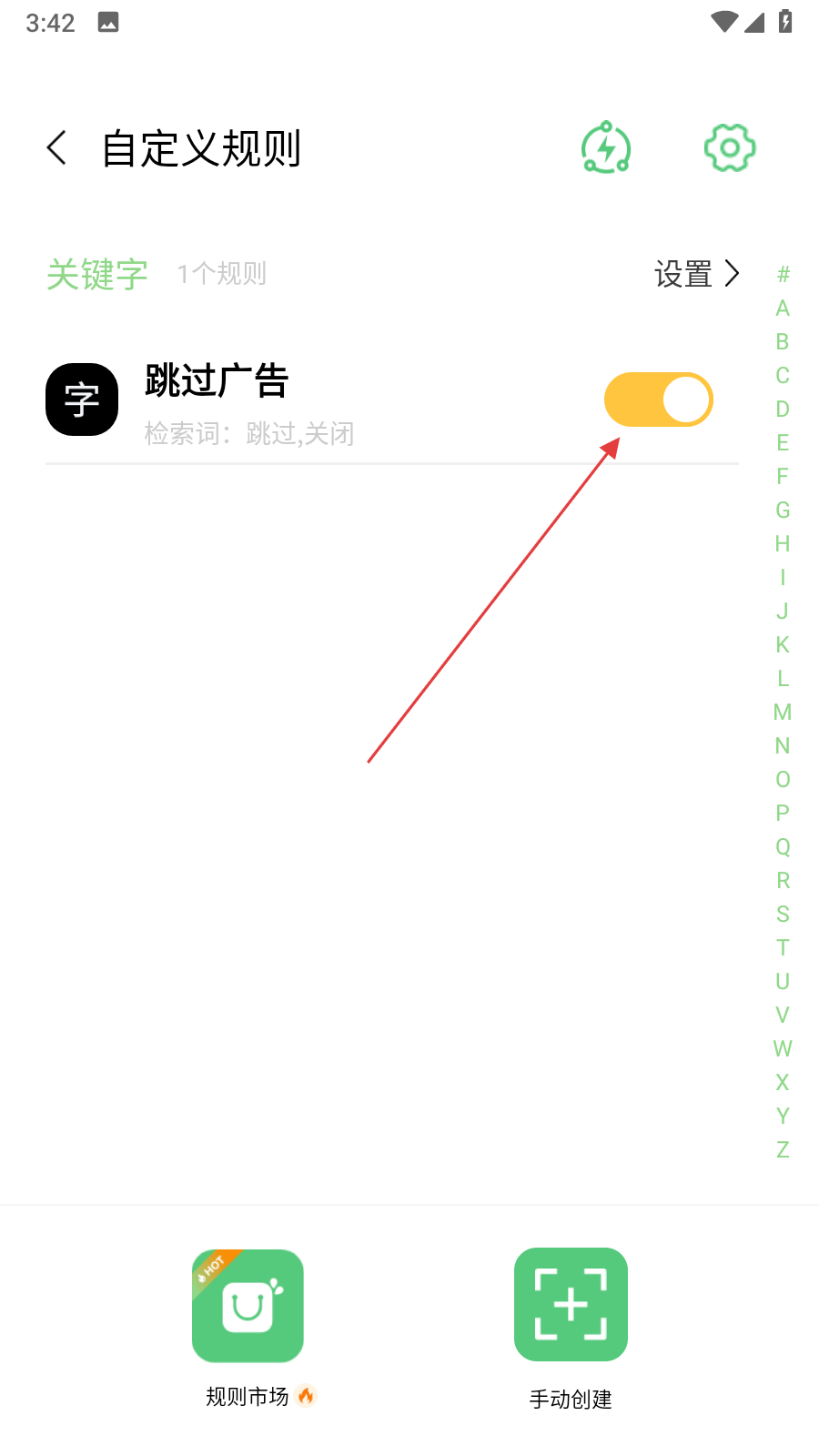 3、導入規(guī)則后,返回自定義規(guī)則界面,能看到已導入的規(guī)則,點擊規(guī)則名稱右側(cè)的開關按鈕將其開啟,這樣自定義規(guī)則就開始生效,后續(xù)打開相關應用時便能按照規(guī)則執(zhí)行操作。