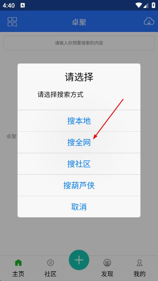 3、在彈出的搜索方式選擇框中,點擊“搜全網(wǎng)”,進入全網(wǎng)搜索界面。
