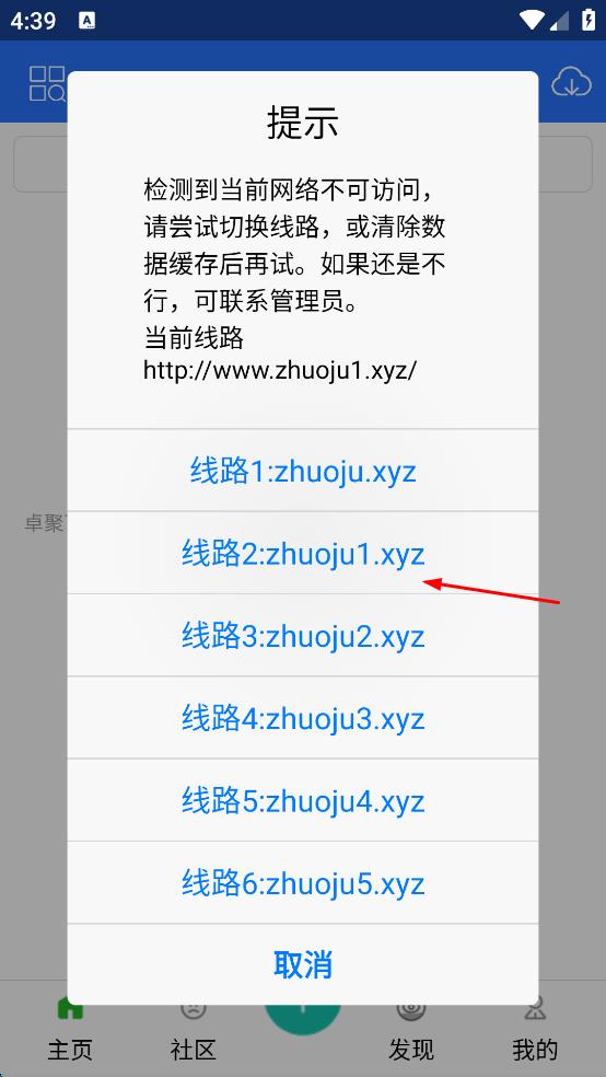 1、打開卓聚APP,若出現(xiàn)網(wǎng)絡不可訪問提示,選擇合適線路如“線路2:zhuoju1.xyz”,切換網(wǎng)絡。