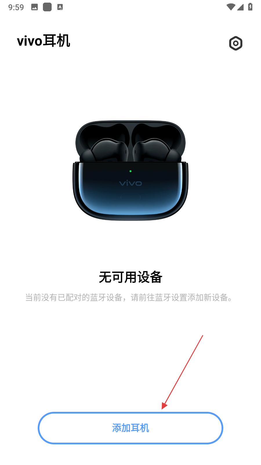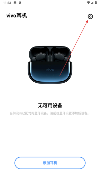 1、打開vivo耳機(jī)APP,進(jìn)入主界面后點(diǎn)擊右上角的設(shè)置圖標(biāo)。